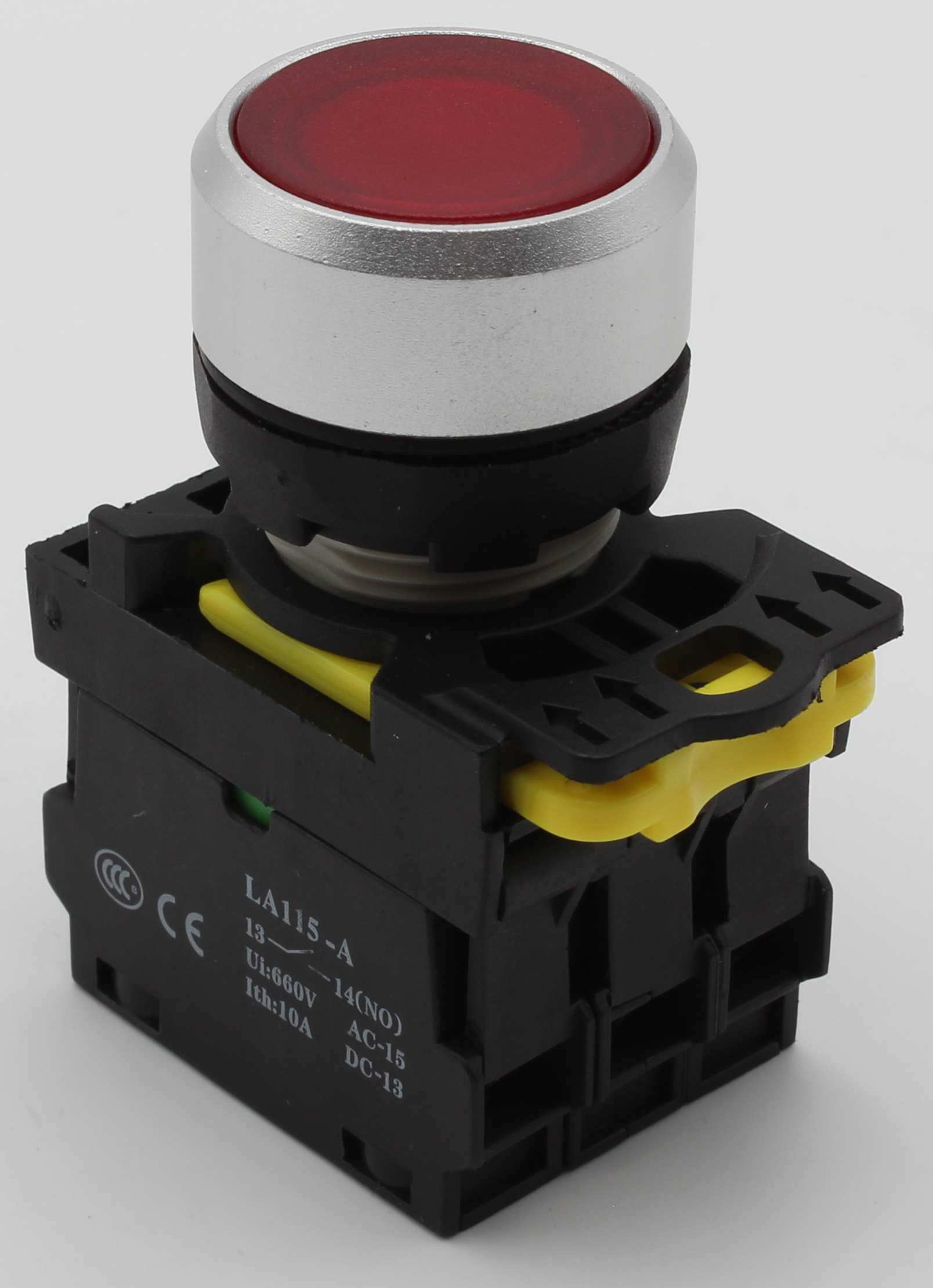 Drukknop, schakelaar of pulsdrukker, rood of groen met 24V led, gat 22mm, ring 30mm, standaard met 1x maak en 1x breek contact.